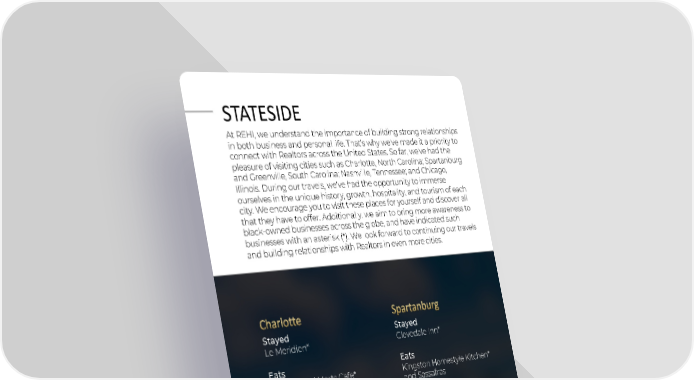 STATESIDE At REHI, we understand the importance of building strong relationships in both business and personal life. That's why we've made it a priority to connect with Realtors across the United States. So far, we've had the pleasure of visiting cities such as Charlotte, North Carolina; Spartanburg and Greenville, South Carolina; Nashville, Tennessee; and Chicago, Illinois. During our travels, we've had the opportunity to immerse ourselves in the unique history, growth, hospitality, and tourism of each city. We encourage you to visit these places for yourself and discover all that they have to offer. Additionally, we aim to bring more awareness to black-owned businesses across the globe, and have indicated such businesses with an asterisk (*). We look forward to continuing our travels and building relationships with Realtors in even more cities. Stayed Stayed Le Meridien* Clevedale Inn* Eats Eats Red Salt and Merts Cafe* Kingston Homestyle Kitchen* and Sassafras Stayed Stayed Dream Hotel and The Urban Sable at Navy Pier Cowboy* Eats Eats STK Steakhouse, Sip and Edleys Bar-B-Que, Slim and Savor*, Girodanos Huskies* Fun Fun Green Mill, Architectural Tour Uncle Nearest Distillery* in by boat Shelbyville. TN 1 hour away, Tootsies Orchid Lounge, National Museum of African American Music* Page| 15