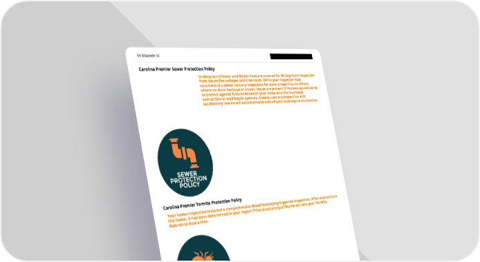 55 Elizabeth St Carolina Premier Sewer Protection Policy Underground Sewer and Water lines are covered for 90 days from inspection from issues like collapse and tree roots. While your inspector may recommend a sewer camera inspection for some properties, on others where no drain backups or known issues are present this coverage will serve to protect against failures between your home and the municipal connection or well/septic systems. A sewer camera inspection with satisfactory results will automatically extend your coverage to six months. Carolina Premier Termite Protection Policy Your home inspection included a comprehensive Wood Destroying Organism Inspection. After evaluation o the home, it has been determined in your report if the structure qualies for our one-year Termite Assurance Guarantee. Carolina Premier Inspections LLC Page 11 of 78