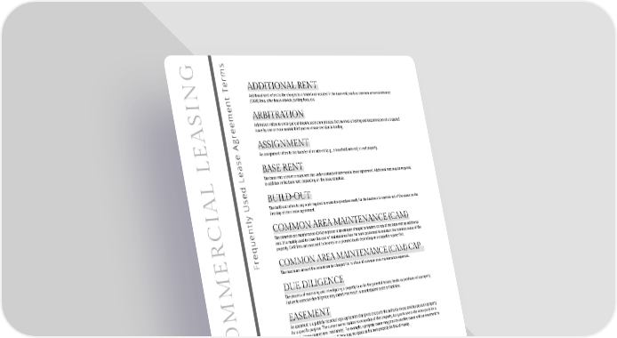 s m G r e ADDITIONAL RENT T Additional rent refers to the charges to a tenant not included in the base rent, such as common area maintenance t N (CAM) fees, after-hours service, parking fees, etc. n I e ARBITRATION m S Arbitration refers to a non-judicial dispute resolution process that involves a hearing and determination of a disputed e issue by one or more neutral third parties whose decision is binding. e r A g ASSIGNMENT A E An assignment refers to the transfer of an interest (e.g., a leasehold interest) in real property. e s L a BASE RENT e The base rent is the minimum rent due under a standard commercial lease agreement. Additional rent may be required, L in addition to the base rent, depending on the lease structure. d L e BUILD-OUT s A The build-out refers to any work required to make the premises ready for the business to operate out of the space on the U first day of their lease agreement. I y l t COMMON AREA MAINTENANCE (CAM) n C e The common are maintenance (CAM) expense is an amount charged to tenants on top of the base rent as additional u rent. It is mainly used to cover the cost of maintenance fees for work performed to maintain the common areas of the property. CAM fees are assessed to tenants on a prorated basis depending on occupiable square feet. q R e r COMMON AREA MAINTENANCE (CAM) CAP F E The maximum amount the tenant can be charged for its share of common area maintenance expenses. DUE DILIGENCE M The process of examining and investigating a property by or for the potential tenant, lender or purchaser of a property. Failure to exercise due diligence may sometimes result in unanticipated costs or liabilities. M EASEMENT An easement is a publicly-recorded legal agreement that gives one party the authority to use another person’s property O for a specific purpose. The current owner maintains ownership of that property, but grants use to the other party for a period of time (sometimes indefinitely). For example, a property owner may provide another owner with an easement to use a strip of land as a driveway if there was no space on his own property for that driveway. C EXCLUSIVITY Prohibiting an owner from leasing to another tenant with similar business uses. Exclusivity provisions are common in retail leasing situations. FIT-OUT Fit-out typically refers to activities making a commercial tenant interior space suitable for occupation. Often, a tenant’s own contractor does fit-out construction, as opposed to the landlord’s construction company. MINIMUM RENT (“BASE RENT”) In the context of commercial lease agreements, the minimum rent refers to the base, fixed rent applicable for a certain period. Minimum rent can be subject to adjustment periodically, based on negotiated terms. REHI 843.300.5387 www.rehouseintl.com