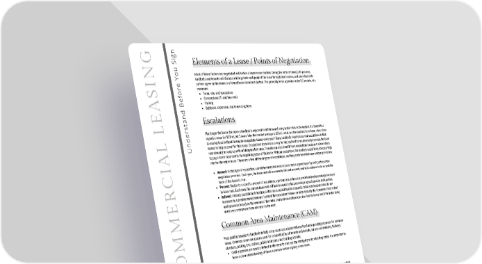 n g i G S Elements of a Lease / Points of Negotiation u o Most of these factors are negotiated well before a lease is ever drafted. During the letter of intent (LOI) process, N Y landlords and tenants will discuss and negotiate each point of the lease through their brokers, and only when both parties agree on the terms is a formal lease document drafted. The generally terms agreed to in the LOI include, at a I e r minimum: o Term, rate, and escalations S f Concessions (TI and free rent) e Parking B A Sublease, expansion, and renewal options d n E a Escalations t s L r The longer the lease, the more a landlord is exposed to inflation and rising rental rates in the market. If a tenant has e signed a lease for $20/sf, but 5 years later the market average is $30/sf, what can the landlord do to keep rates close d to market level without having to renegotiate leases every year? Many landlords require base rent escalations in their n L leases to help account for this issue. Escalations are used as a way for the landlord to incrementally increase the base U rent annually to keep up with inflating market rates. Tenants can also benefit from escalations because it allows them to pay a lower base rent in the beginning years of the lease. Without escalations, the landlord would likely charge a high A rate for the entire lease. There are a few different types of escalations, and they each have their own unique provisions: I Amount: In this type of escalation, a predetermined increase in base rent is agreed upon by both parties in the negotiation process. Each year, the base rent will increase by this set amount, and will continue to do so until the C term of the lease is over. Percent: Similar to a specific amount of escalation, a percent escalation is a predetermined percentage increase in base rent. Each year, the current base rent will be increased by the percentage agreed upon by both parties. R Indexed: Indexed escalations introduce a little more variability into a tenant’s rental rate because they do not increase by a predetermined amount. Instead, the escalation follows an index (usually the Consumer Price Index) and increases based on the amount of the index. Indexed escalations can also lead to lower rent if the index being E used sees a decrease from one year to the next. M Common Area Maintenance (CAM) Fees paid by tenants to landlords to help cover costs associated with overhead and operating expenses for common areas. Common areas are spaces used for or benefited by all tenants and include, but are not limited to, hallways, M elevators, parking lots, lobbies, public bathrooms and building security. CAM expenses are usually defined in the lease to clear up any ambiguity as to what they entail. It is important to have a clear understanding of these expenses before signing a new lease. O Exclusivity C An exclusivity clause is a clause in a commercial lease that grants a tenant the exclusive right to engage in a certain type of activity at that location. Ask for exclusivity for your building or complex. If you're a dentist, that means no other dental offices can open in your building. If you build a restaurant, make sure there can be no direct competitors to the cuisine you offer, etc. Right of First Refusal Right of first refusal (ROFR), also known as first right of refusal, is a contractual right to enter into a business transaction with a person or company before anyone else can. Make sure you have first right of refusal should the building or unit ever become available for sale. In other words, should your landlord decide to put the building or unit up for sale that they come to you first to offer. REHI 843.300.5387 www.rehouseintl.com