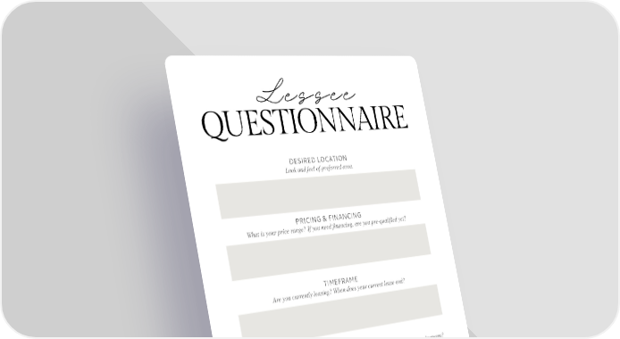 Lessee QUESTIONNAIRE DESIRED LOCATION Look and feel of preferred area. PRICING & FINANCING What is your price range? If you need financing, are you pre-qualified yet? TIMEFRAME Are you currently leasing? When does your current lease end? INTERIOR What does your ideal space look like? Bathrooms? Total square feet? Other requirements? EXTERIOR Employee and customer parking needs? Loading area? Other exterior requirements?
