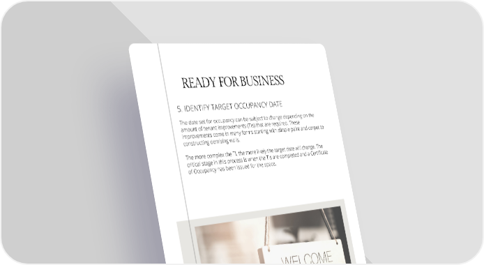 READY FOR BUSINESS 5. IDENTIFY TARGET OCCUPANCY DATE The date set for occupancy can be subject to change depending on the amount of tenant improvements (TIs) that are required. These improvements come in many forms starting with simple paint and carpet to constructing demising walls. The more complex the TI, the more likely the target date will change. The critical stage in this process is when the TIs are completed and a Certificate of Occupancy has been issued for the space. 6. MOVE IN Once everything is ready, the fun part begins.