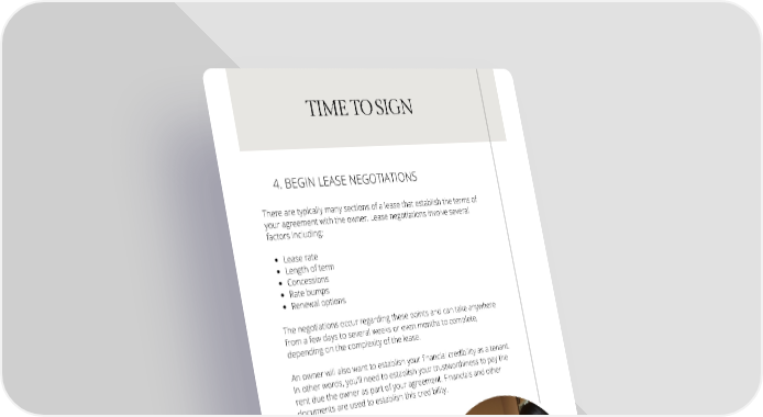TIME TO SIGN 4. BEGIN LEASE NEGOTIATIONS There are typically many sections of a lease that establish the terms of your agreement with the owner. Lease negotiations involve several factors including: Lease rate Length of term Concessions Rate bumps Renewal options The negotiations occur regarding these points and can take anywhere from a few days to several weeks or even months to complete, depending on the complexity of the lease. An owner will also want to establish your financial credibility as a tenant. In other words, you’ll need to establish your trustworthiness to pay the rent due the owner as part of your agreement. Financials and other documents are used to establish this credibility.